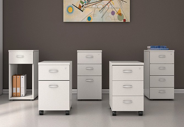 Cajoneras en melamina con abs de 2mm. Opciones: Con cajones Rodante Pedestal Con cajones y espacio para CPU Con cajón para archivo y cajón común. Con cerradura de traba colectiva