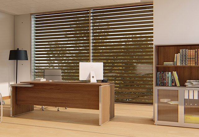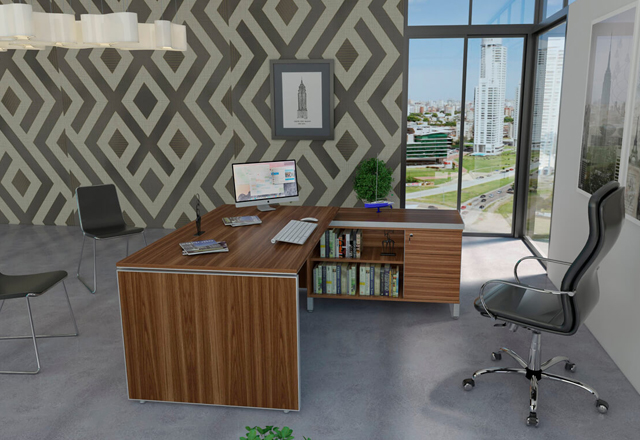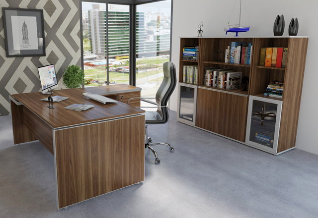 Escritorios con cajonera pedestal o rodante, con o sin extensión en L, bibliotecas con alzadas y biblioteca baja con puertas batientes, varios colores, medidas.