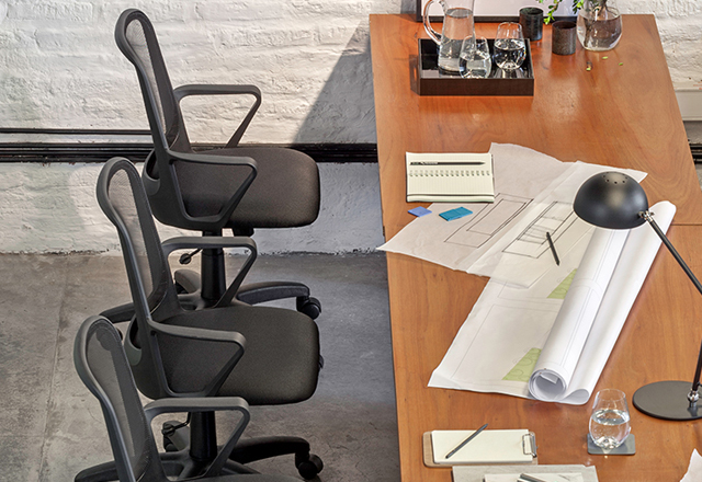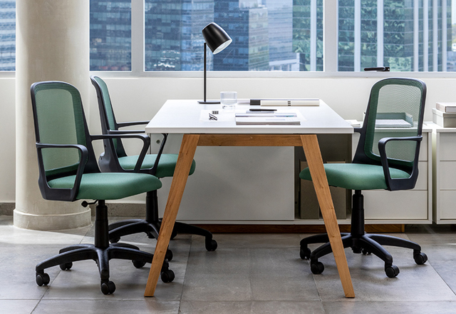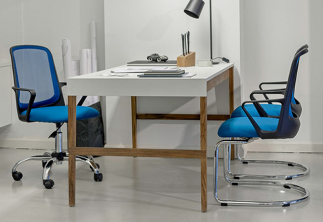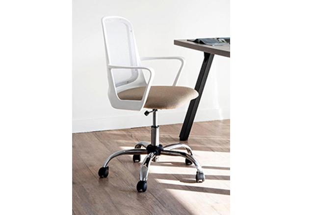 Tapizado en tela o ecocuer. Respaldo tapizado en tela de red. Apoyabrazos fijos incorporados de manera estructural al respaldo. Regulación neumática de altura del asiento. Espuma de asiento de alta densidad. Base compuesta por nylon y fibra de vidrio de alta resistencia.