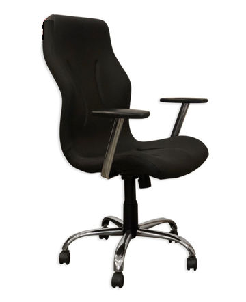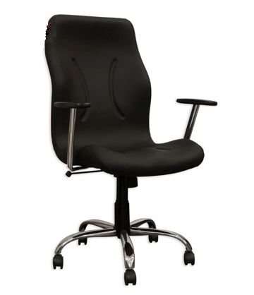 Sillon de respaldo medio, monocasco de espuma inyectada y moldeada, con canales de aireación, tapizado en tela o ecocuer, regulación neumática de altura, con apoyabrazos fijos, base estrella de nylon reforzado o metálica cromada de 5 ramas con ruedas.